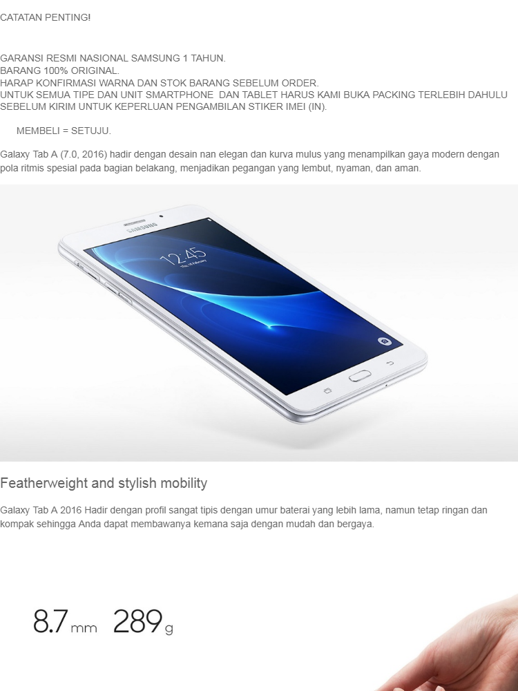 Itulah data tentang produk Samsung Galaxy Tab A 2016 T285 - 7" yang bisa kami berikan untuk Anda, beli segera sebelum kehabisan. Untuk melihat ulasan dari para pembeli, Anda bisa mengunjungi tokonya dengan link kunjungi toko .